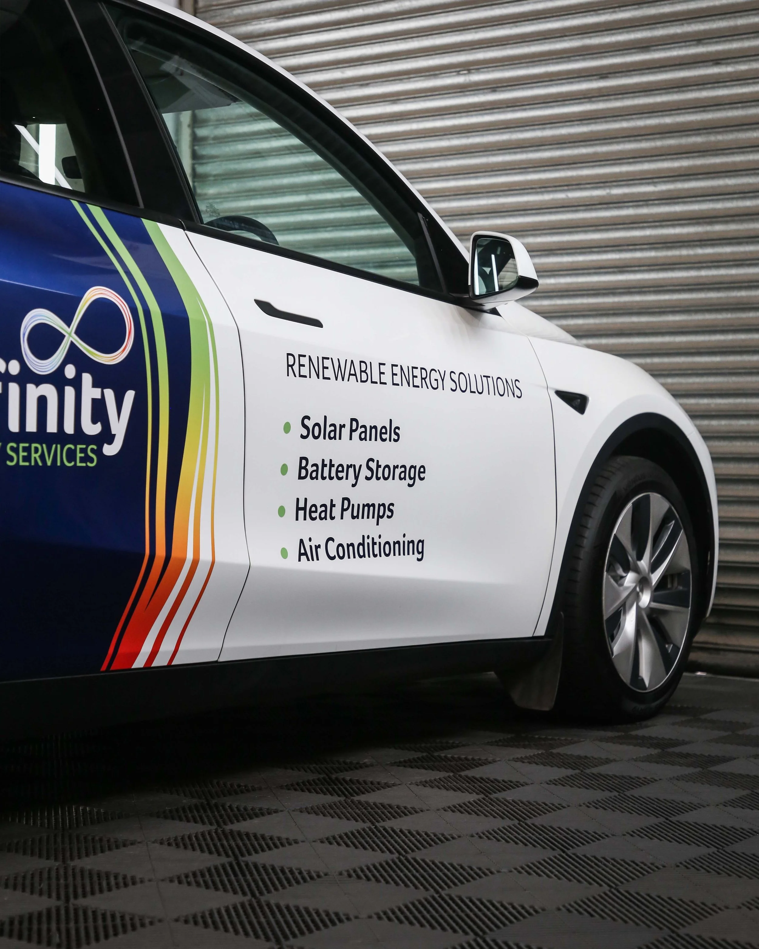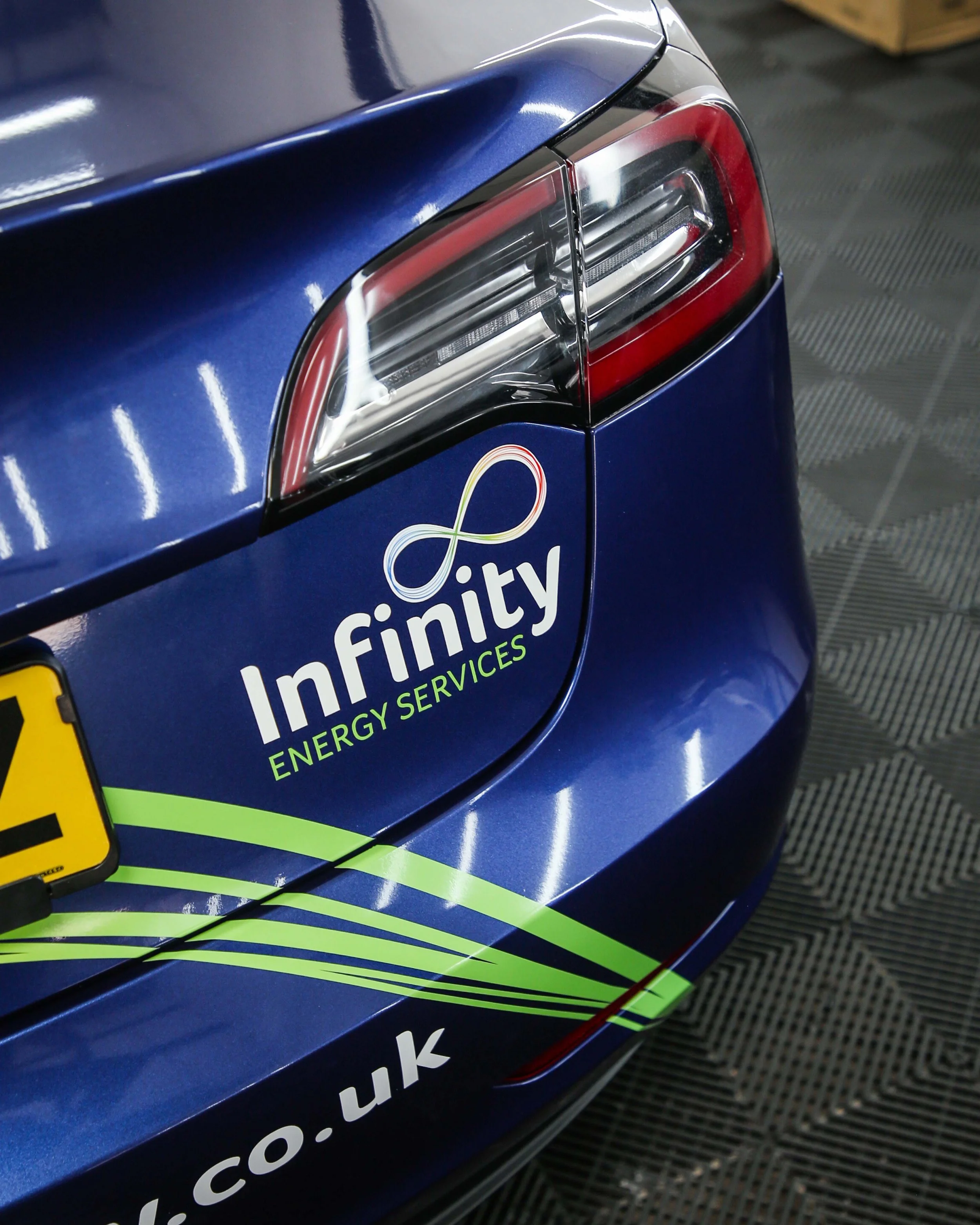 We have been working with Infinity Energy for a number of years - wrapping their entire fleet of Transit Custom vans. To add to that growing fleet, we also branded up their new pool cars (Tesla Model 3 Long Range and Tesla Model Y). Both featuring a rear quarter wrap in Oracal Gloss Deep Blue Metallic, with the printed ‘Infinity’ swoop applied on top!. Finished with those all important company contact details and logos.