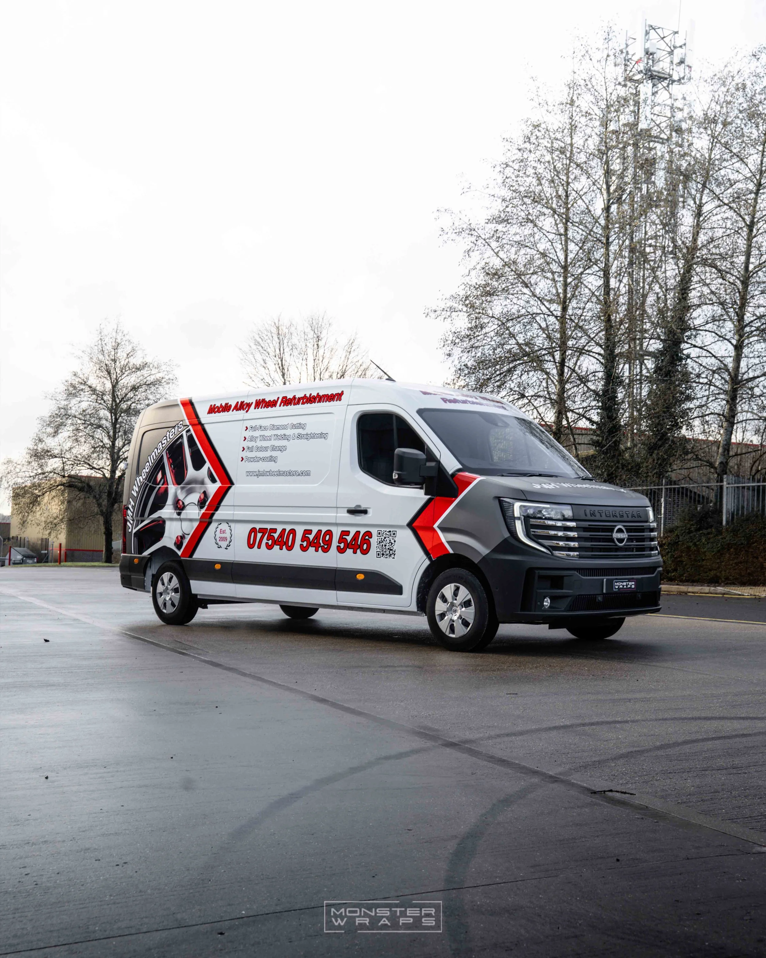 This commercial vehicle wrap for JMH Wheelmasters was fully designed and produced in-house. We combined a matte dark grey base with high-gloss branded graphics to create a bold, modern contrast that stands out on the road. To elevate the design further, custom alloy wheel visuals were printed and seamlessly integrated into the wrap layout, reinforcing the brand’s specialist identity.