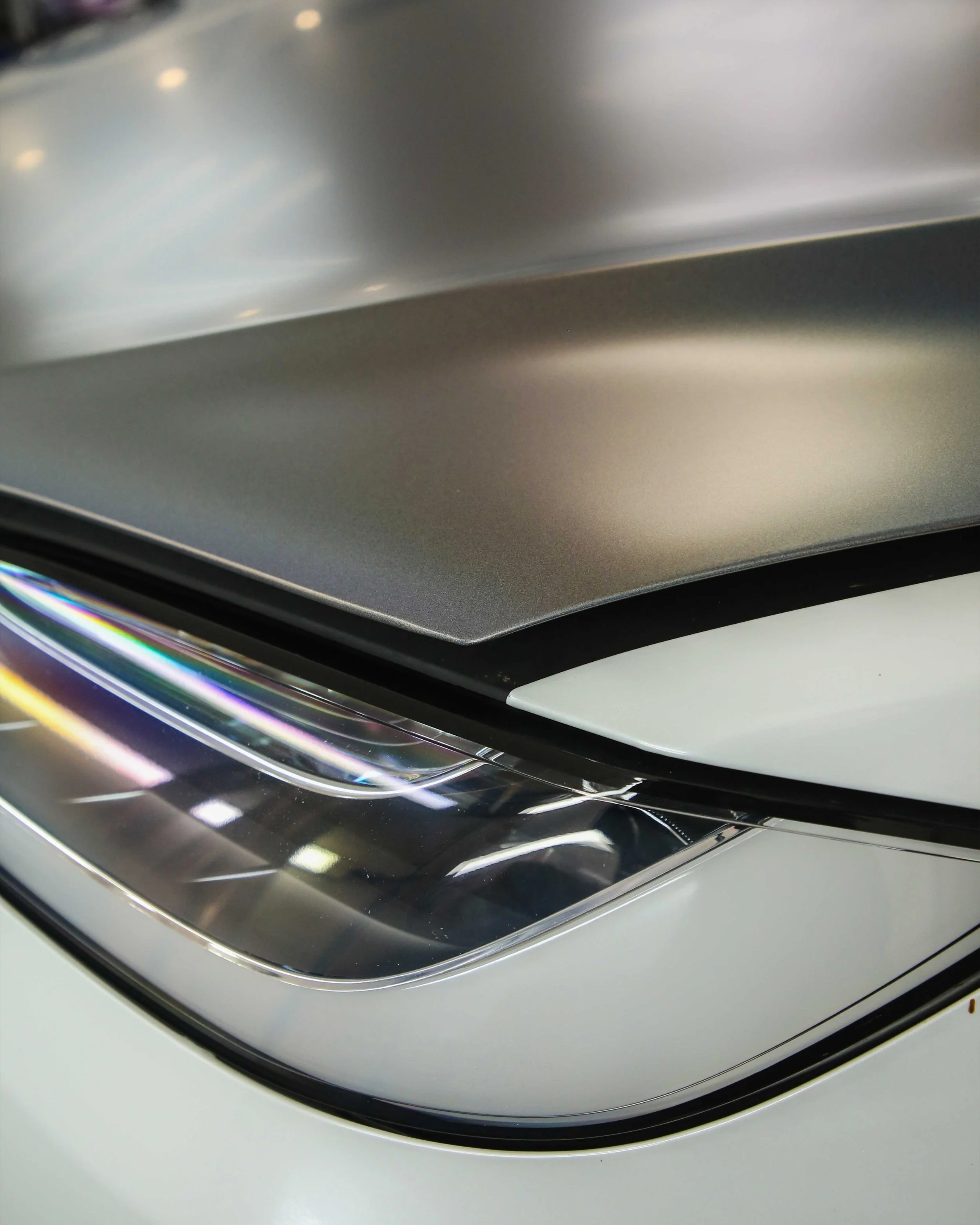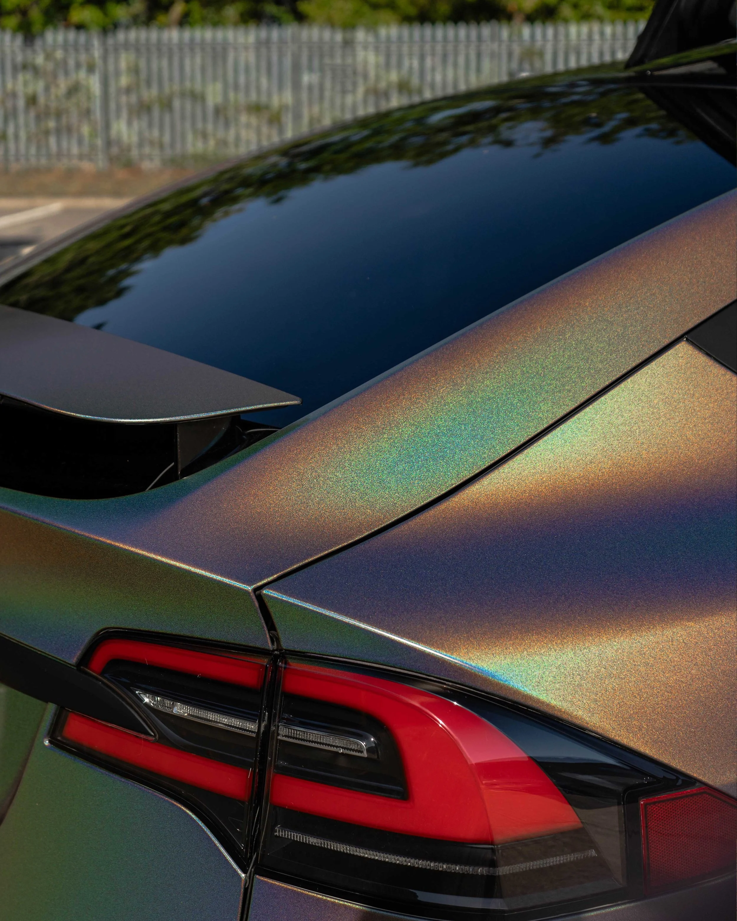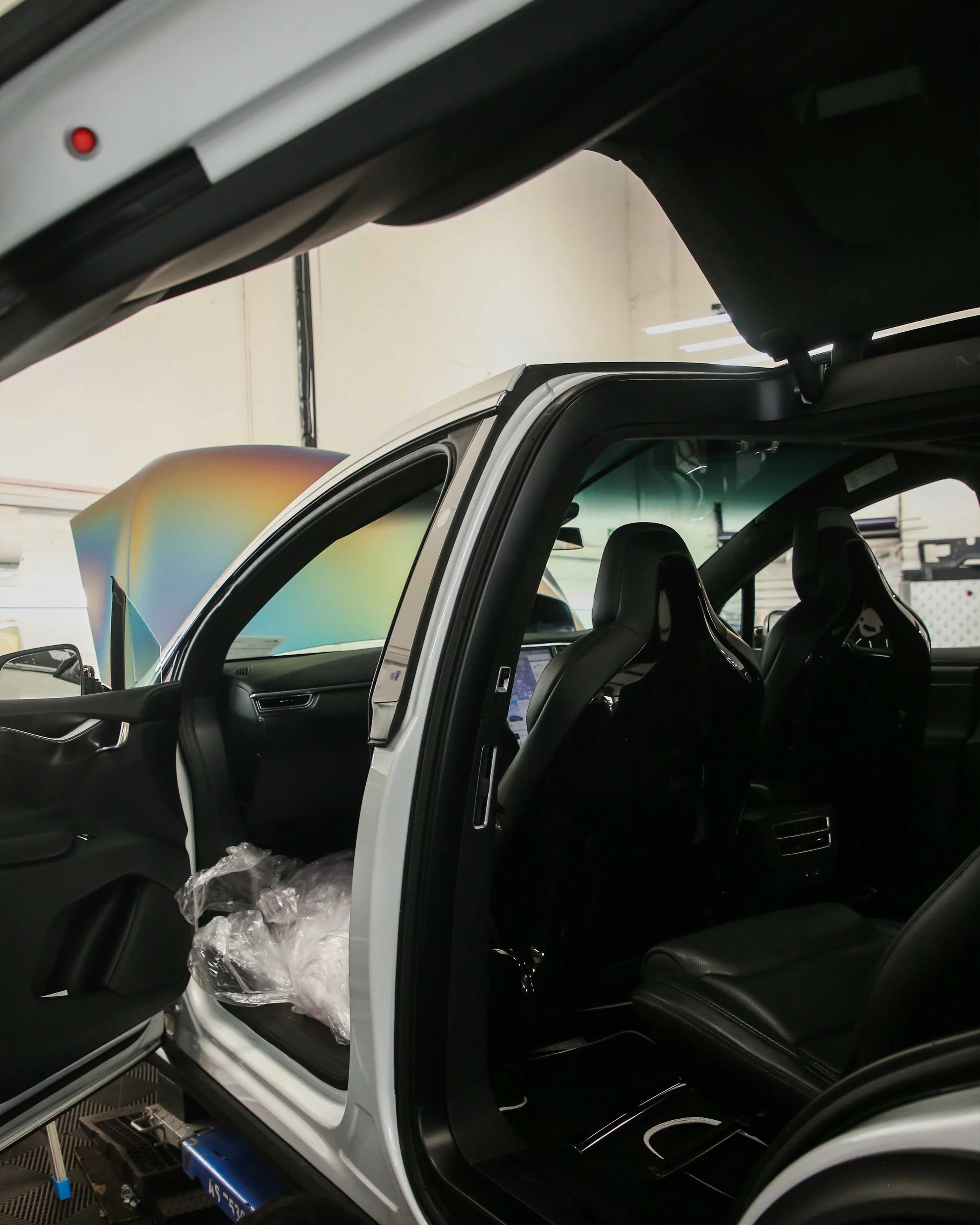 The transformation on this Tesla Model X is simply out of this world! We gave this car a whole NEW look with a full wrap including door shuts and returns in 3M 2080 Satin Flip Psychedelic . We also painted the calipers in Gloss Performance Red, and gave the vehicle a full chrome delete in Satin Black, powder-coated the wheels and protected the wrap with a full CeramicPRO coating!