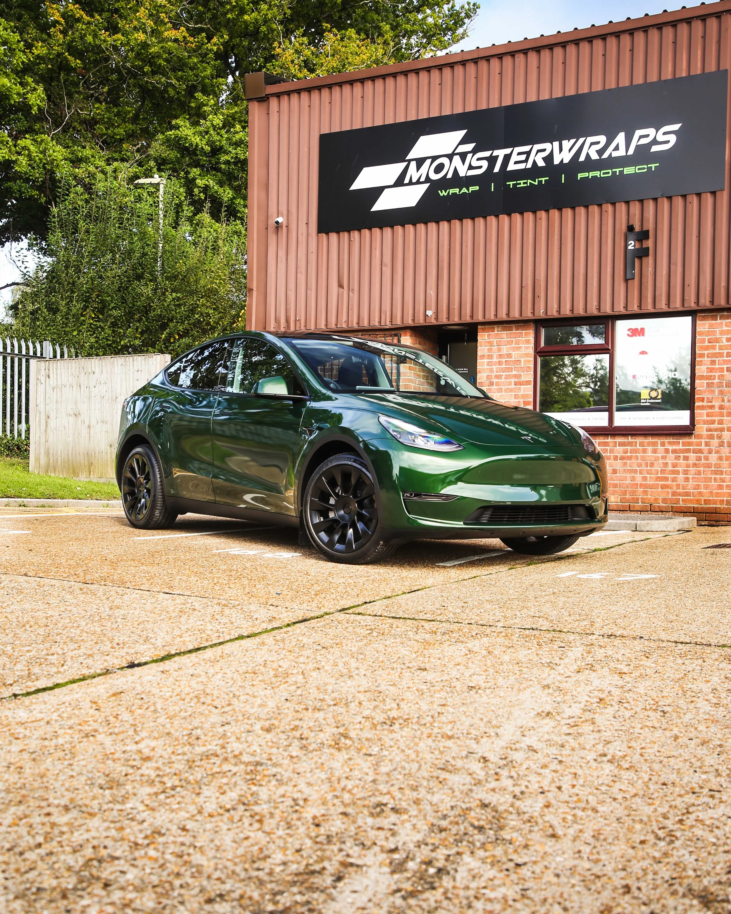 Tesla Model Y transformed with a full external colour change vinyl wrap in Hexis Gloss Sherwood Green. This colour is very understated but once the sun hits it, the colour really does pop! This wrap was protected with a super hydrophobic coating of CeramicPRO Top Coat.